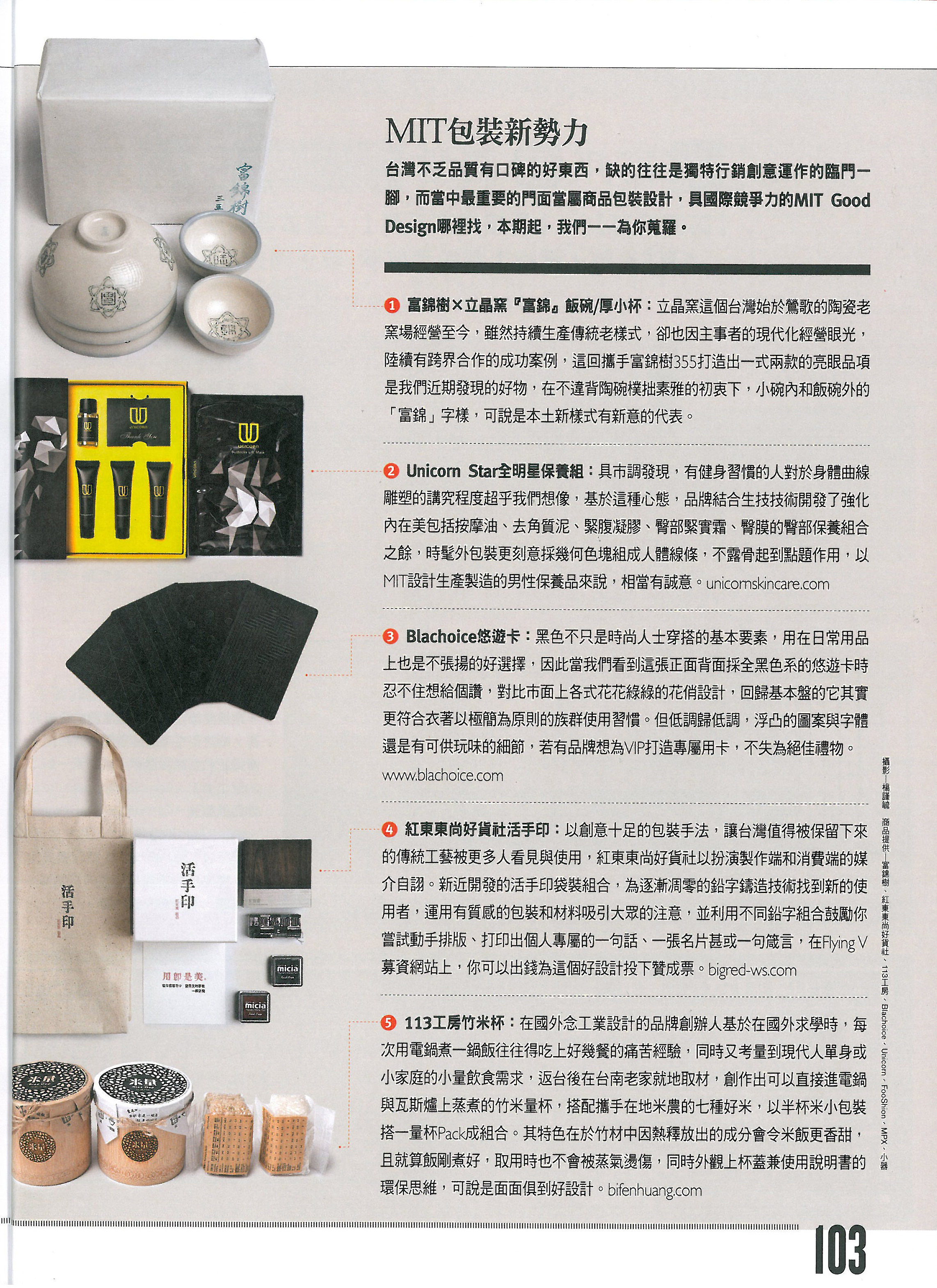 「米量-竹米杯」登上 GQ BUSINESS 雜誌 113工房登上了『GQ BUSINESS 第8期 page 103』 在國外念工業設計的品牌創辦人基於在國外求學時,每次用電鍋煮一鍋飯往往得吃上好幾餐的痛苦經驗,同時又考量到現代人單身或小家庭的小量飲食需求,返臺後就地取材,創作出可以直接進電鍋與瓦斯爐上蒸煮的竹米量杯,搭配攜手在地米農的七種好米,以半杯米小包裝搭一量杯Pack成組合。其特色在於竹材中因熱釋放出的成分會令米飯更香甜,且就算飯剛煮好,取用時也不會被蒸氣燙傷,同時外觀上杯蓋兼使用說明書的環保思維,可說是面面俱到好設計。 ◆GQ BUSINESS 分享此文: 按一下即可分享至 X(在新視窗中開啟) X 按一下以分享至 Facebook(在新視窗中開啟) Facebook 分享到 Pinterest(在新視窗中開啟) Pinterest 更多 按一下即可以電子郵件傳送連結給朋友(在新視窗中開啟) 電子郵件 分享到 LinkedIn(在新視窗中開啟) LinkedIn 分享到 Tumblr(在新視窗中開啟) Tumblr 分享到 Pocket(在新視窗中開啟) Pocket 分享到 WhatsApp(在新視窗中開啟) WhatsApp 按一下以分享到 Telegram(在新視窗中開啟) Telegram 喜歡 正在載入... 2015-09-092017-07-22 by 113工房 | 113kobo Categories: 媒體報導 Press 發表留言
